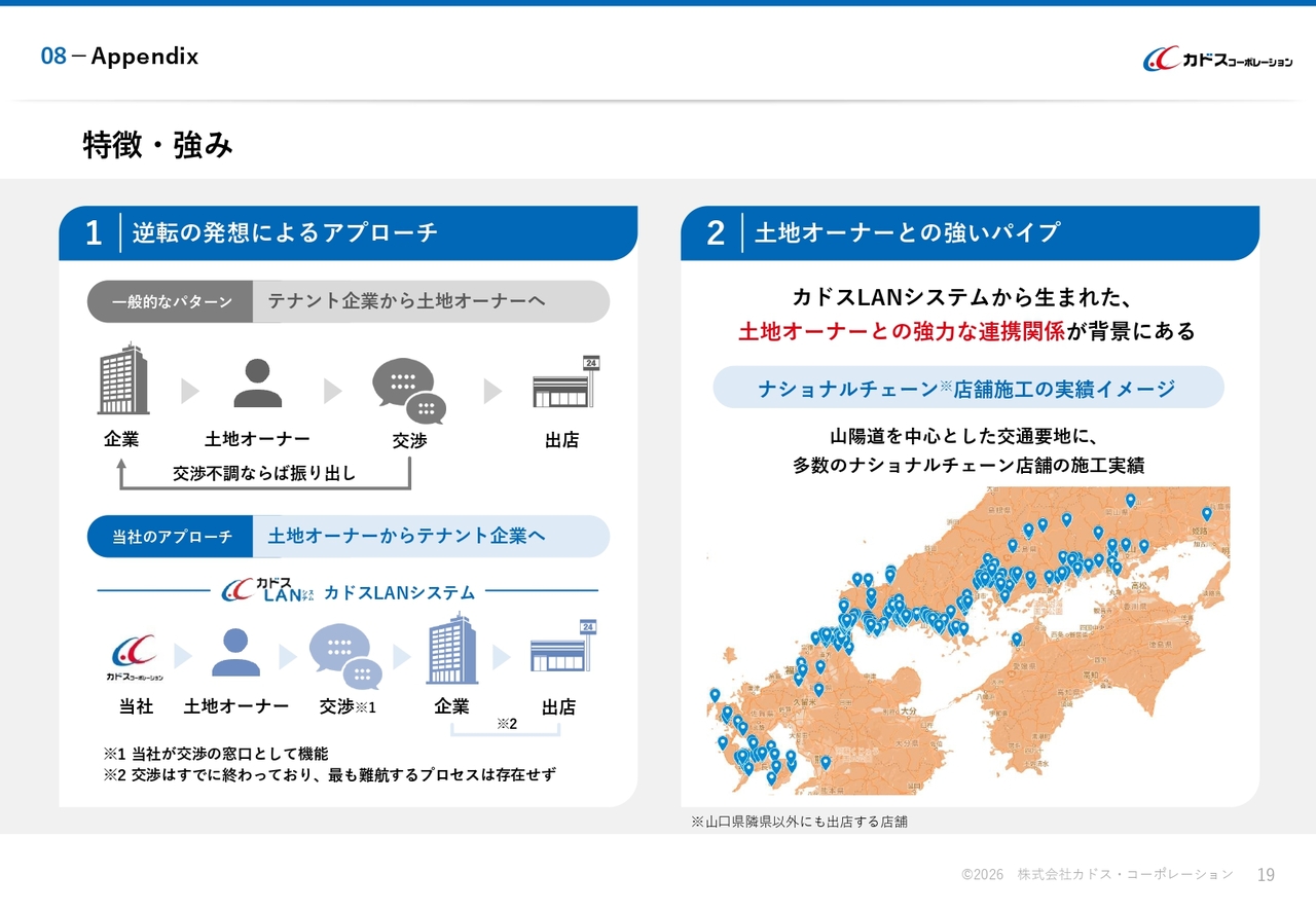 2点目は「土地オーナーとの強いパイプ」になります。山陽道を中心とした交通要地において、多数のナショナルチェーン店舗の施工実績を持ち、当社の営業手法である「カドスLANシステム」を活用した取引を通じて、竣工後も土地オーナーに寄り添い、信頼関係を深めてきました。その結果、新規の土地情報取得や既存契約の期間満了後の再活用においても優位なポジションを築いています。