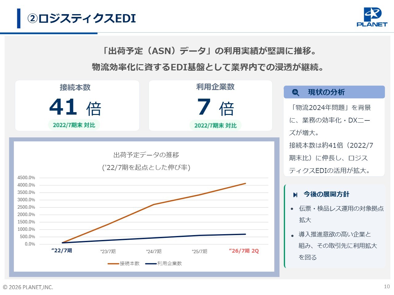 スライド左下のグラフをご覧ください。本データの利用は拡大傾向にあり、2022年7月期末との比較で接続本数は41倍、利用企業数は7倍と大きく伸びました。今後は、伝票・検品レス運用の対象拠点を広げ、業界全体の物流生産性の改善につなげていく方針です。