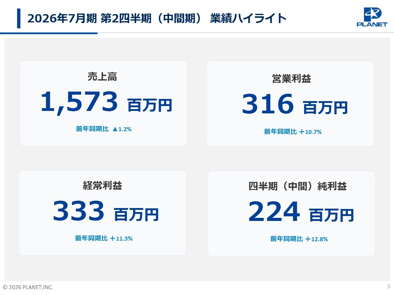 決算概要についてご説明します。スライドは2026年7月期第2四半期の業績ハイライトです。売上高は前年同期比1.2パーセント減の15億7,300万円となりました。営業利益は前年同期比10.7パーセント増の3億1,600万円、経常利益は前年同期比11.3パーセント増の3億3,300万円、四半期純利益は前年同期比12.8パーセント増の2億2,400万円で、前期比で減収増益の結果となりました。