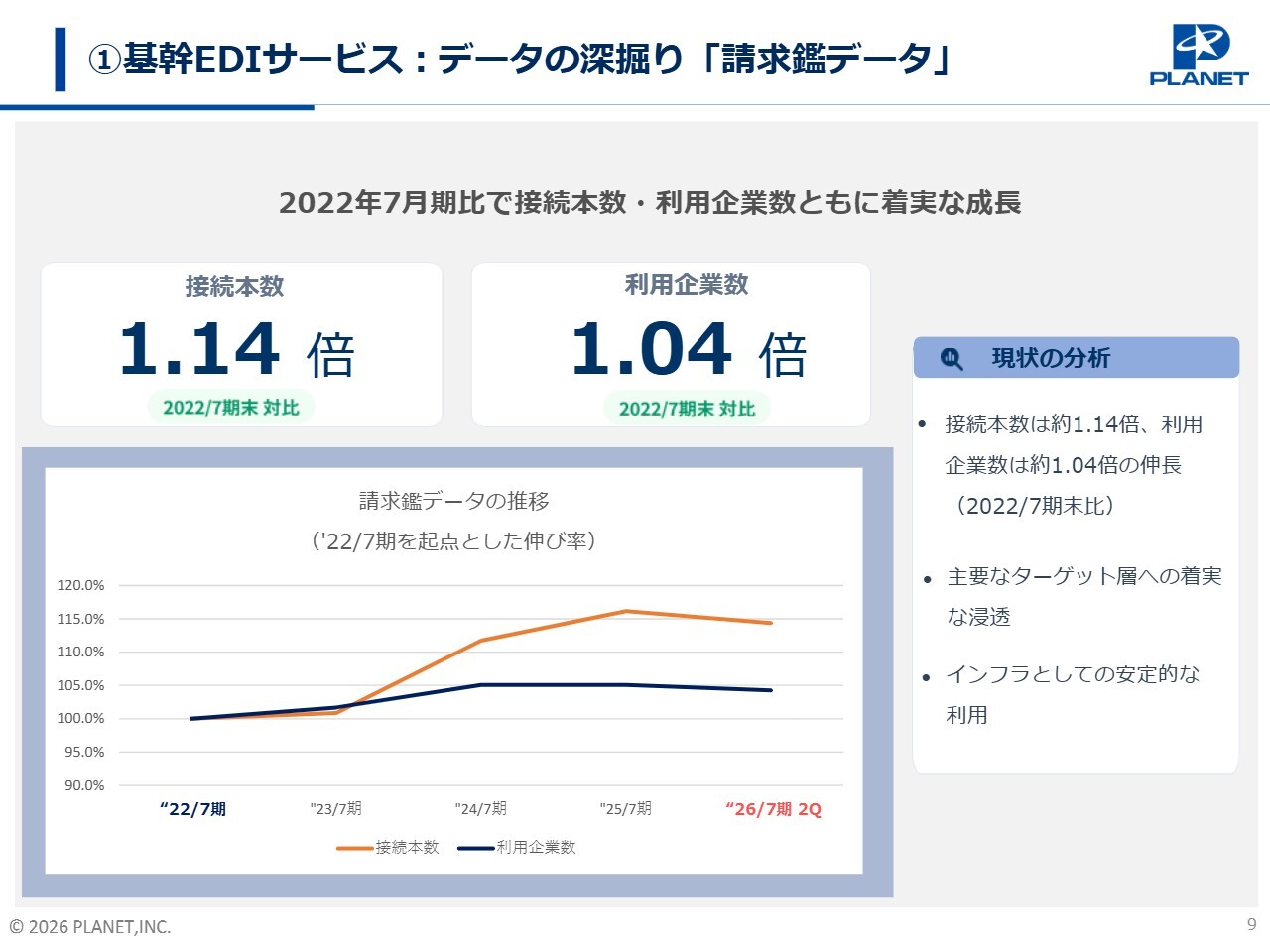 スライド左下のグラフをご覧ください。2022年7月期末を起点とした伸び率を見ると、直近の2026年7月期第2四半期末において、接続本数は1.14倍、利用企業数は1.04倍と着実に増加しています。