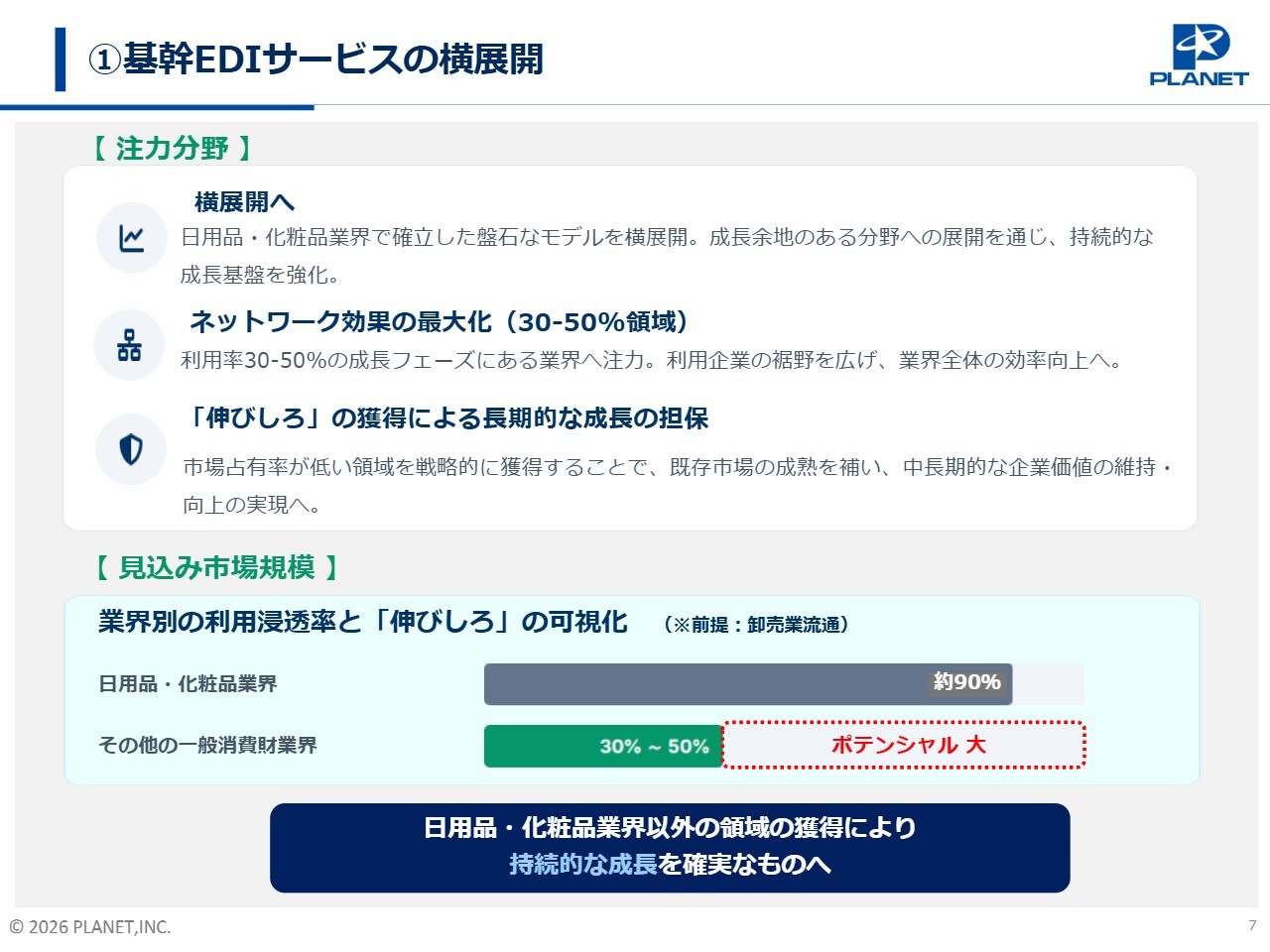 1つ目の「基幹EDIサービス」の横展開についてご説明します。現在、当社が主力としている日用品・化粧品業界では、当社のEDIの利用浸透率がすでに約90パーセントに達していると見ています。一方、横展開のターゲットとしているペット関連やOTC医薬品といった近隣業界での浸透率は、30パーセントから50パーセント程度と推計しています。