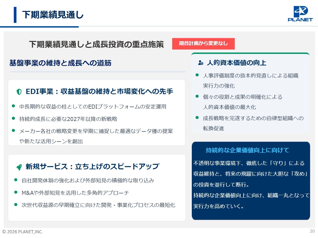 下期の業績の見通しについてご説明します。下期の業績については、期首計画から変更はありません。今後も事業基盤の維持と成長への道筋作りを両輪で進めていきます。