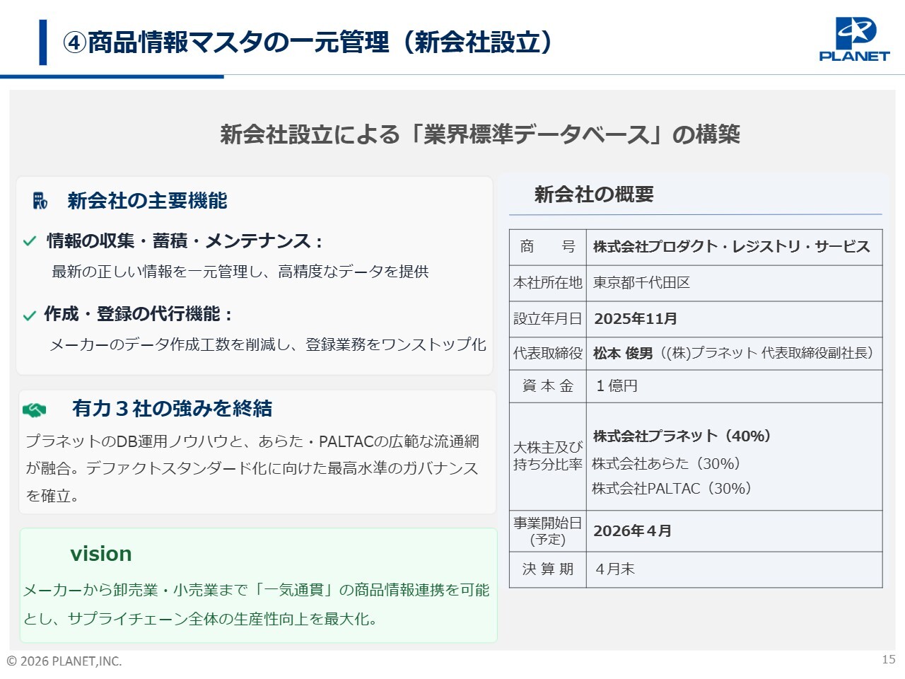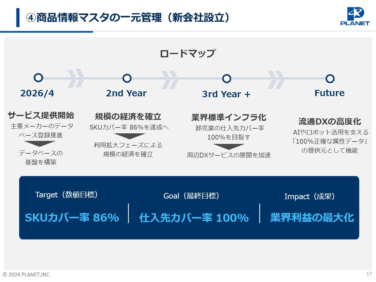4つ目の成長戦略である「商品情報マスタの一元管理(新会社設立)」についてご説明します。