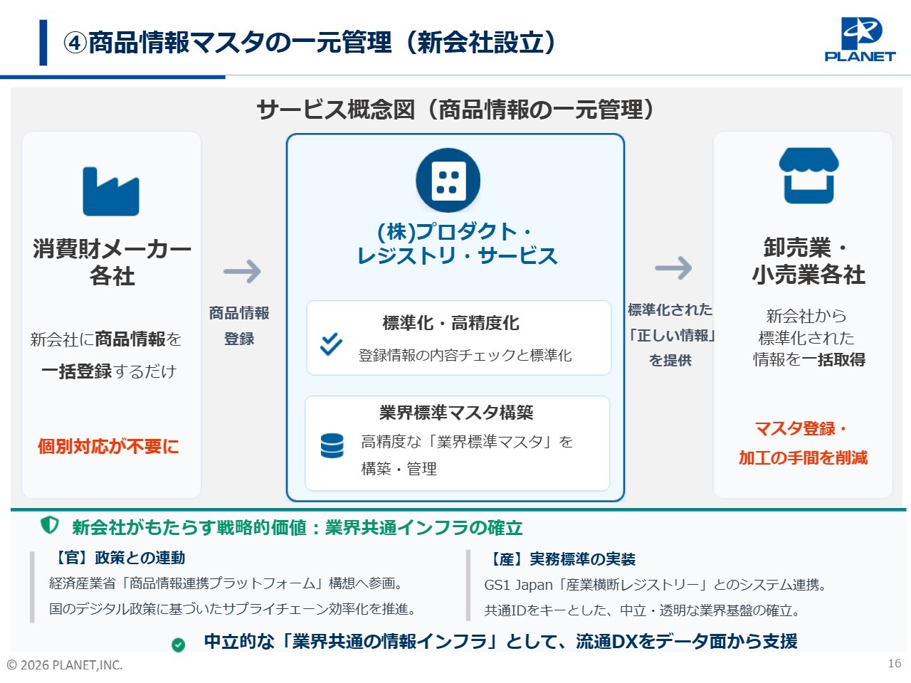 こちらのスライドは、新会社のサービス概念を表した図です。中央に新会社であるプロダクト・レジストリ・サービスが位置し、メーカー・卸売業・小売業各社をつなぐハブの役割を果たします。