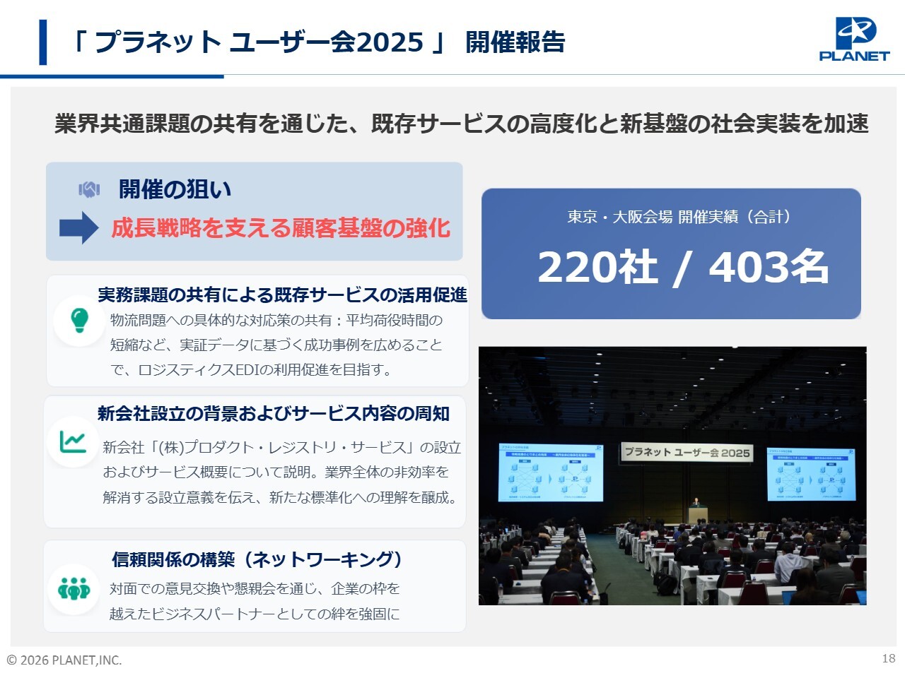 この方針のもと、昨年も「プラネットユーザー会2025」を東京と大阪の2会場で開催しました。2会場合計で220社403名と多くの方々にご参加いただき、業界共通の課題解決に向けた有意義な情報交換の場とすることができました。