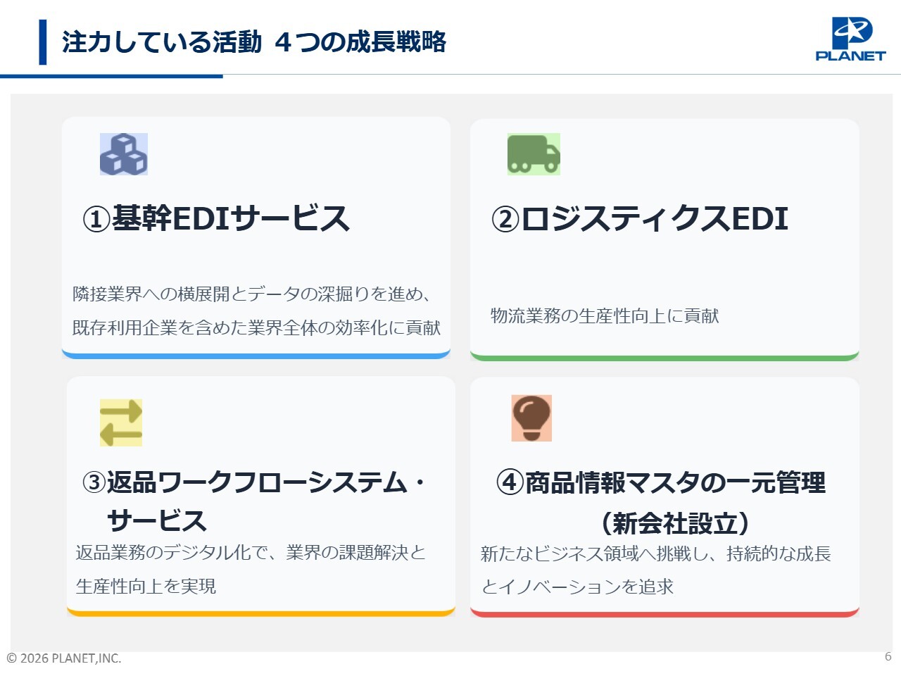 1つ目は、隣接業界への横展開とデータの深掘りを進め、業界全体の効率化に資する「基幹EDIサービス」の推進です。2つ目は、物流業務の生産性向上に貢献する「ロジスティクスEDI」です。3つ目は、返品業務のデジタル化を推進する「返品ワークフローシステム・サービス」です。4つ目は、新たなビジネス領域への挑戦として「商品情報マスタの一元管理」を目的とした新会社の設立です。順を追ってご説明します。