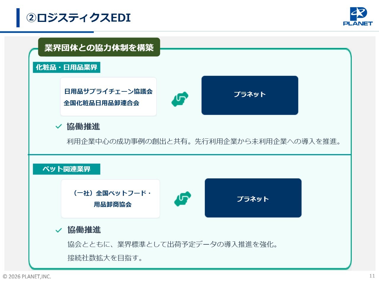 また、「基幹EDIサービス」の横展開と同様に、ペット関連業界でも取り組みを加速させていきます。「全国ペットフード・用品卸商協会」との協働を通じて、出荷予定データなどの業界標準化に向けた導入推進を強化しており、接続社数のさらなる拡大を目指しています。