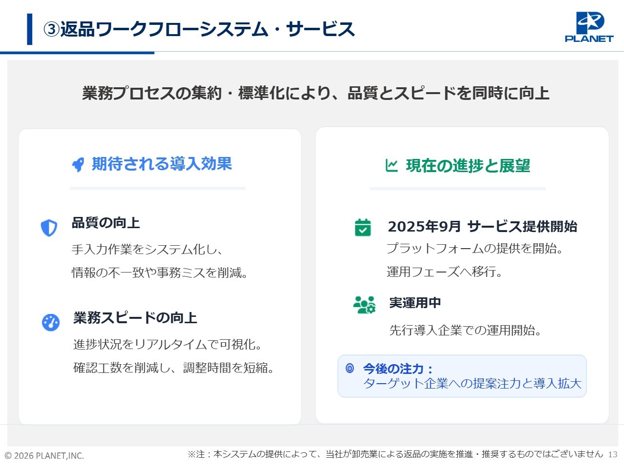 3つ目の成長戦略である「返品ワークフローシステム・サービス」についてご説明します。