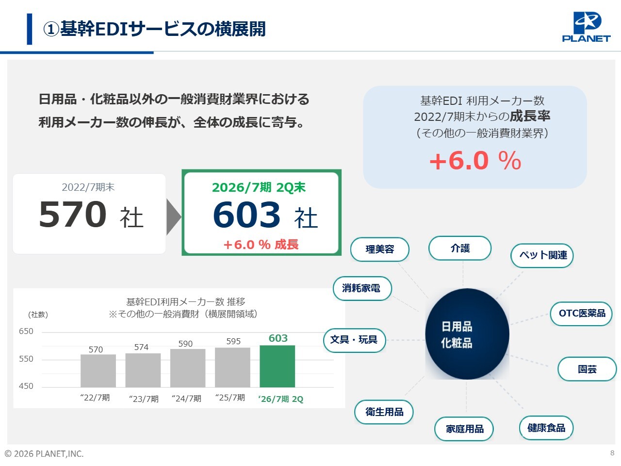 横展開の実績についてご説明します。スライド中央の表をご覧ください。ペット関連やOTC医薬品など、日用品・化粧品以外の利用メーカー数は、2022年7月期末時点で570社でした。2026年7月期第2四半期末には、利用メーカー数が603社まで増加し、6パーセントの成長を達成しました。
