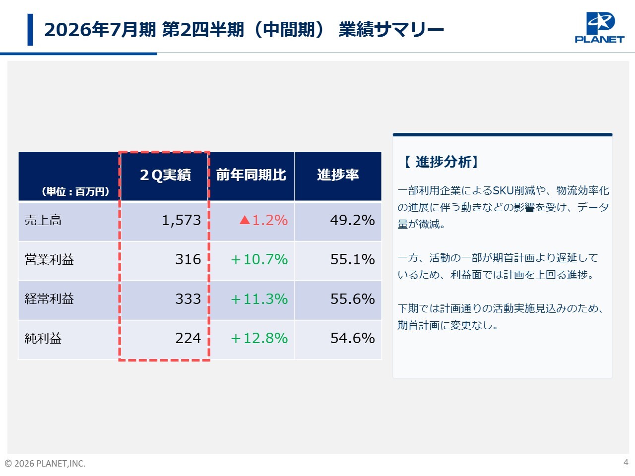 坂田政一氏(以下、坂田):株式会社プラネット代表取締役社長兼執行役員社長の坂田です。本日はご多用の中、第2四半期決算説明会にご参加いただき、誠にありがとうございます。