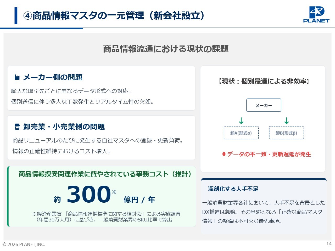 こうした個別対応や度重なる修正作業に費やされている事務コストは、年間約300億円にものぼると推計されています。人手不足を背景に、正確な商品マスタ情報の整備を業界共通の最優先事項として解決すべく、新会社を設立しました。