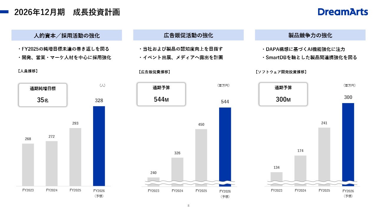 一方で、利益については、中期経営計画の目標達成に向けた初年度として、人材採用や広告販促、製品開発への成長投資を積極的に進める方針です。AI関連の開発に伴う材料費の増加を見込んでいることもあり、前期比では増収減益を計画しています。これは中期経営計画に沿った見通しです。