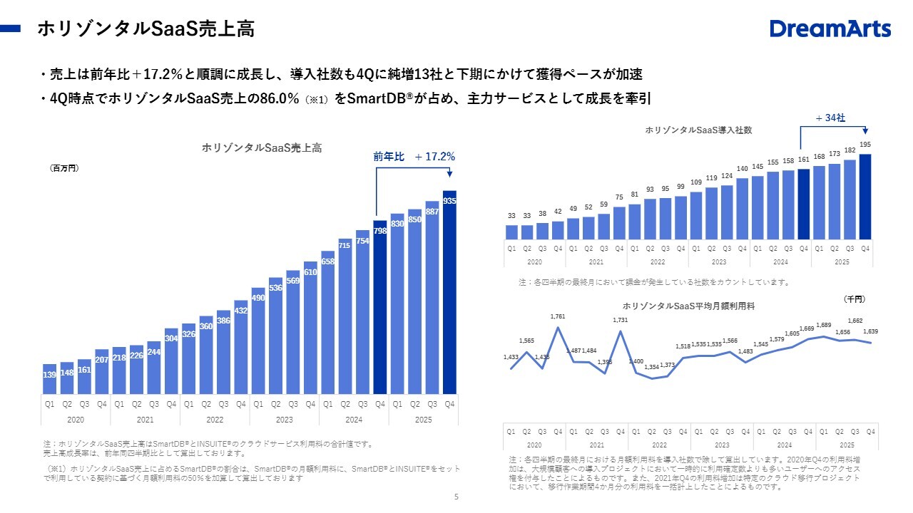 ホリゾンタルSaaSの平均月額利用料(ARPA)は163万9,000円に達し、ホリゾンタルSaaS売上継続率(NRR)は109.8パーセントとなっています。