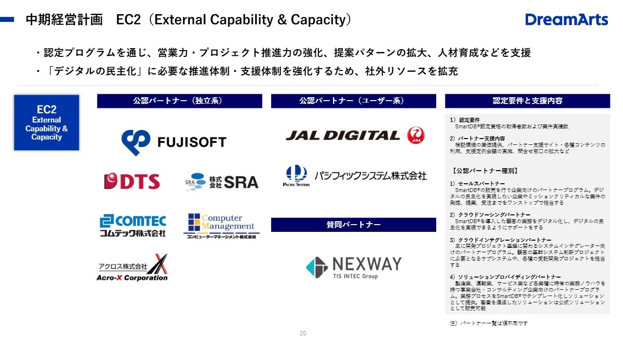 「EC2」において、パートナー施策を開始しています。一昨年に呼びかけを行い、昨年にはスライドに記載している会社にパートナーになっていただきました。今年、来年にはさらに大手にも広がっていくと考えています。引き続き、パートナー施策も強力に推進していきます。