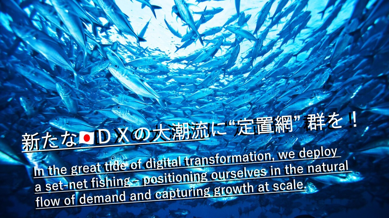 新たな日本のDXの潮流に定置網群をセットし、そこに魚群が来て、それを我々が獲得します。ここで言う魚とはお客さまのことではありません。お客さまが抱えるデジタル化案件を指しています。