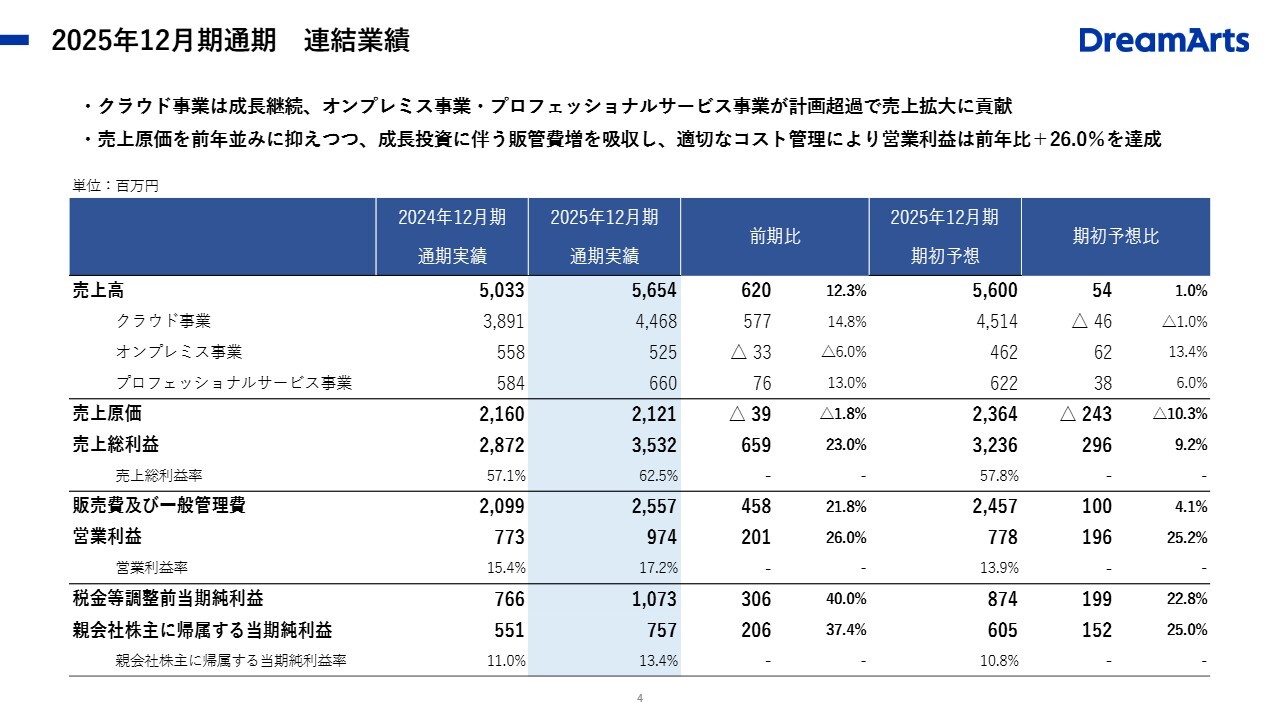 通期の連結業績です。2025年度通期を振り返ると、売上は概ね期初の計画どおりに着地しました。クラウド事業が成長を牽引し、オンプレミス事業とプロフェッショナルサービス事業が計画を上回り、全体の売上を押し上げる結果となりました。