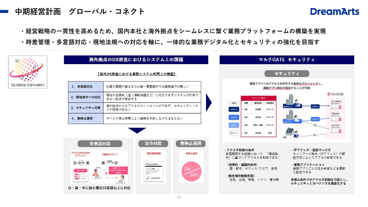 他にも事例はありますが、これまでは積極的には推奨していませんでした。すべてのユーザーに向けて提案できるだけの準備が整っていなかったためです。しかし、中期経営計画の中で「グローバル・コネクト」という取り組みとして積極的に推進していきます。
