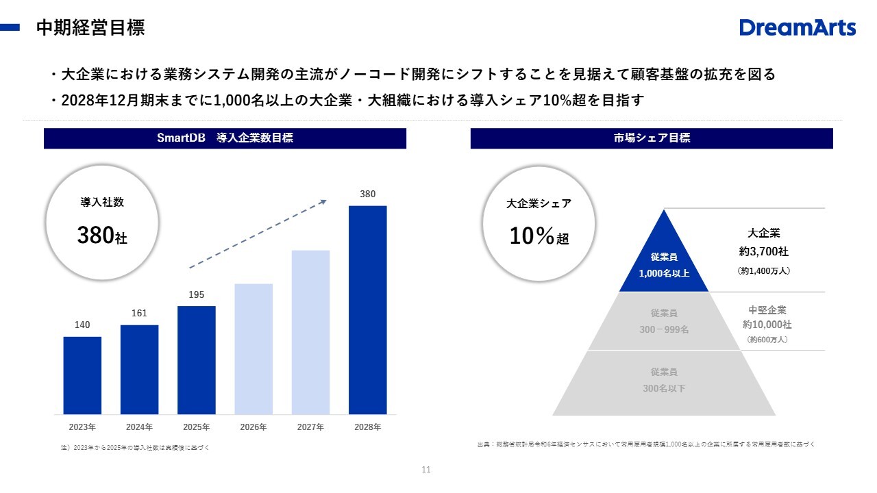 導入社数は2028年度で380社を目指します。市場シェアに関しては、従業員1,000名以上の大企業約3,700社のうち10パーセントを超えるシェアまで引き上げることを目標としています。