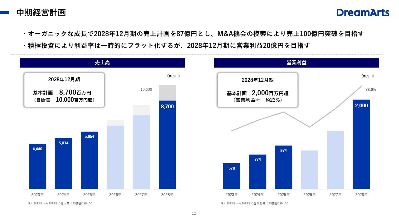 売上高は2028年度に87億円の目標を掲げ、それに向けて成長を促進する施策を進めていくことを考えています。営業利益については、2026年度に前年比で一時的に減益となる見込みですが、2027年度から持ち直し、2028年度には大きな伸びを目指しています。