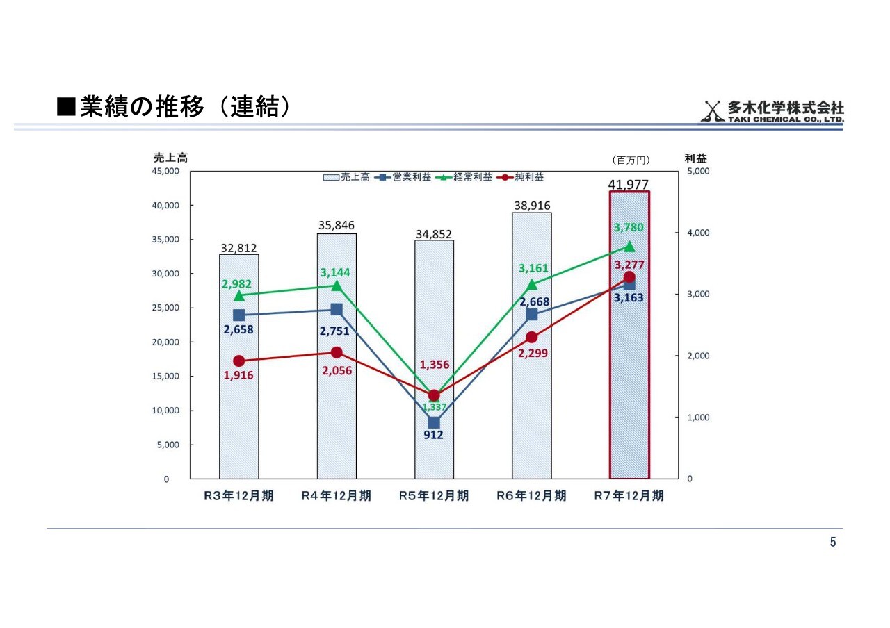 過去5年間では、2023年12月期に一時的な利益の減少局面がありましたが、その後は回復基調が続いています。2025年12月期は、売上高が419億7,700万円、営業利益が31億6,300万円、経常利益が37億8,000万円、純利益が32億7,700万円と、いずれも前期を上回る結果となりました。