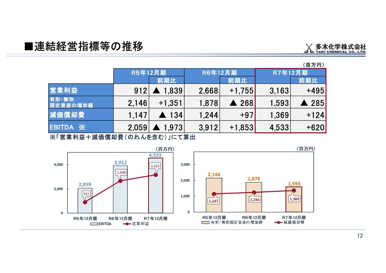 営業利益は前期比4億9,500万円増の31億6,300万円、有形・無形固定資産の増加額は前期比2億8,500万円減の15億9,300万円、減価償却費は前期比1億2,400万円増の13億6,900万円、EBITDAは前期比6億2,000万円増の45億3,300万円となりました。