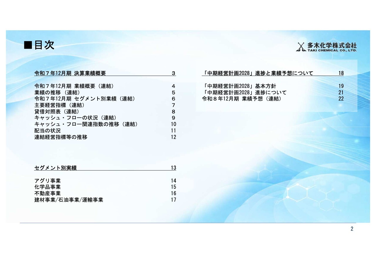 岡本修氏:多木化学株式会社総務人事部部長の岡本修です。2025年12月期決算説明を始めます。