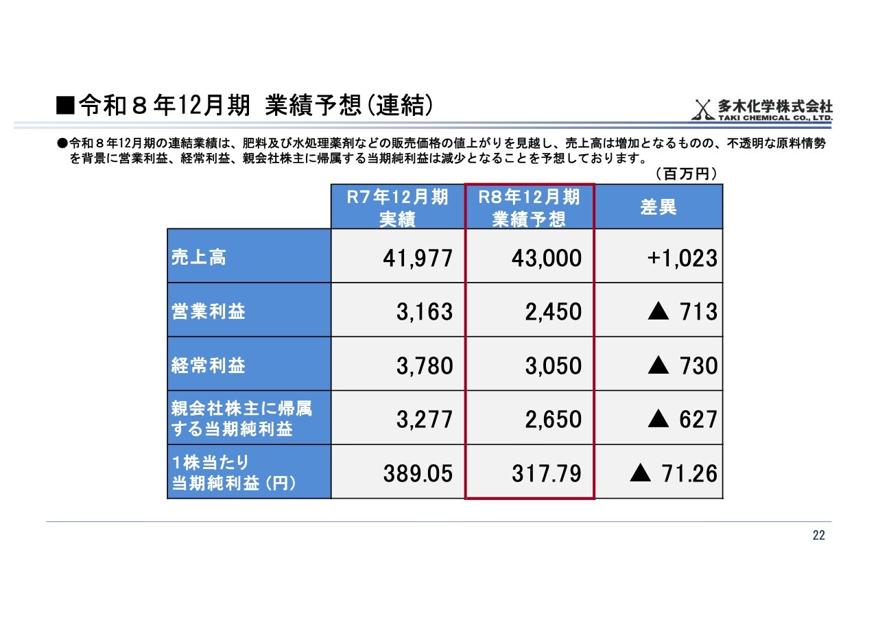 売上高が増加する一方で利益が減少する見通しの主な要因は、肥料および水処理薬剤などの販売価格の値上がりを見込んでいるものの、不透明な原料情勢が継続しているためです。このような環境を踏まえ、2026年12月期は増収減益となる見通しです。