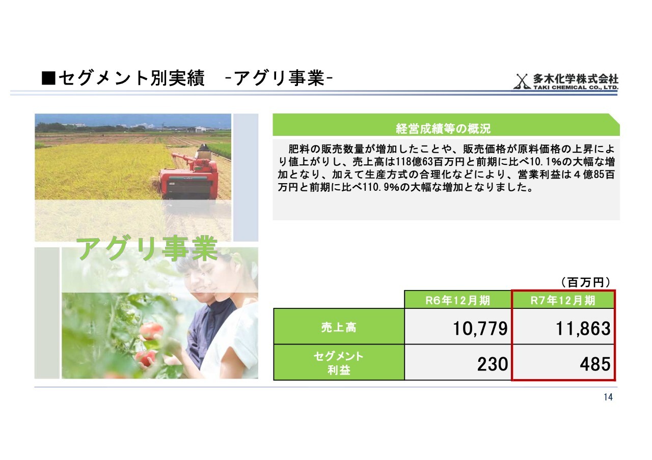 アグリ事業についてご説明します。肥料の販売数量が増加したことに加え、原料価格の上昇により販売価格が値上がりした結果、売上高は前期比10.1パーセント増の118億6,300万円となりました。