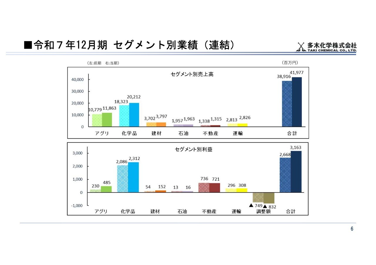 以上のとおり、2025年12月期は不動産事業を除くすべてのセグメントで増収となり、特にアグリ事業および建材事業で大幅な増益となりました。
