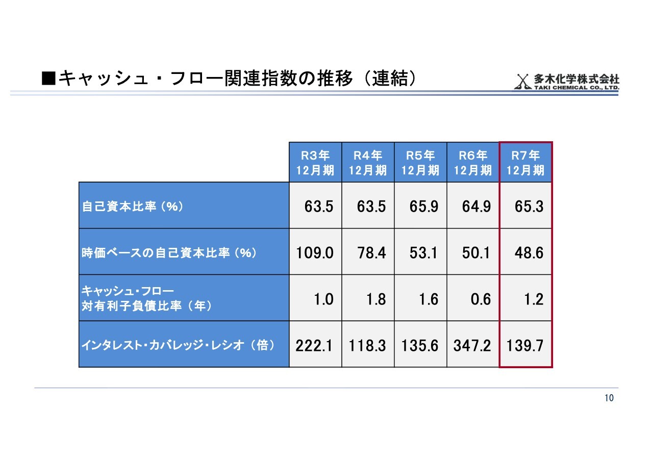 キャッシュ・フロー対有利子負債比率は前期比0.6年増加の1.2年、インタレスト・カバレッジ・レシオは前期比207.5倍減少の139.7倍となりました。