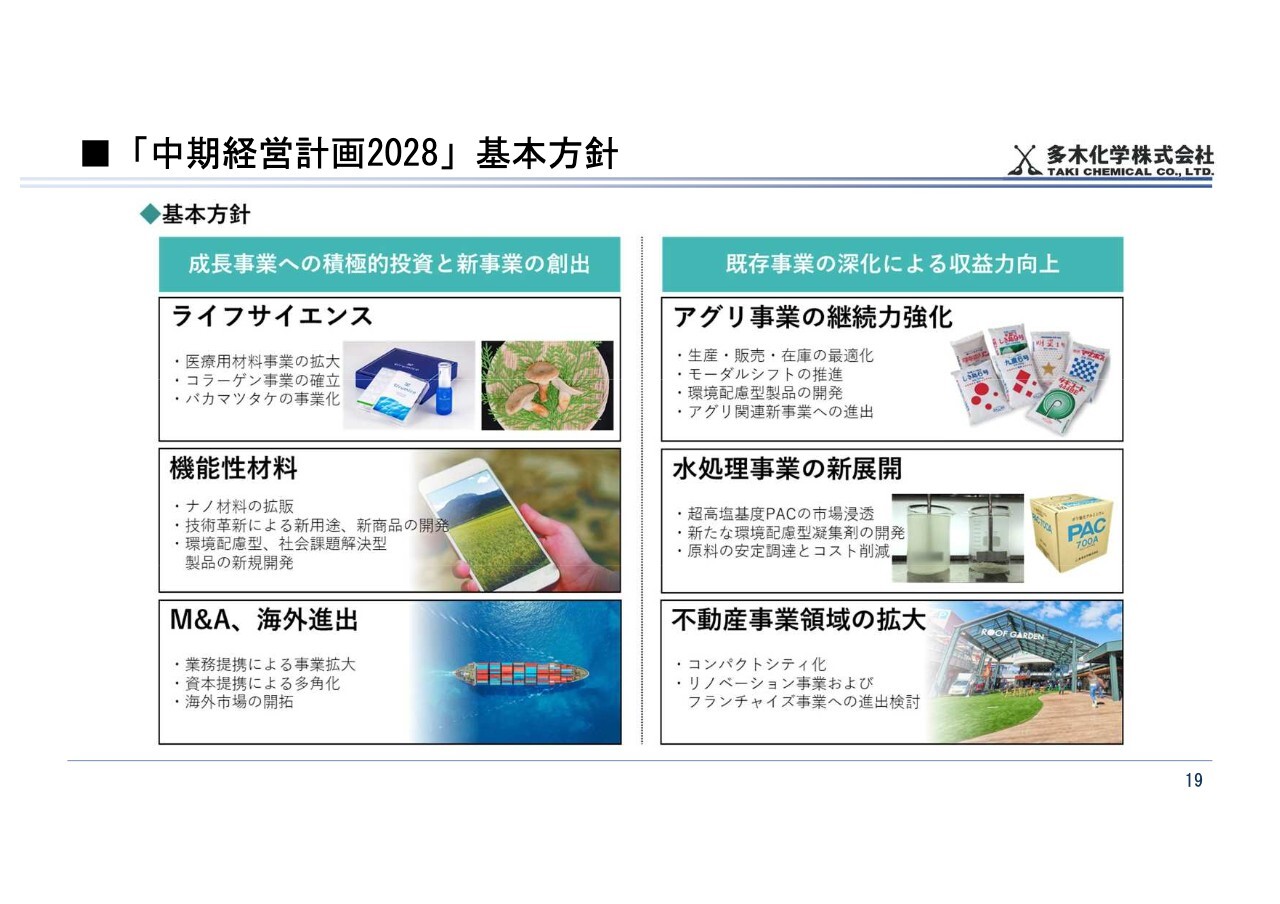 「中期経営計画2028」の基本方針についてご説明します。基本方針は4つあり、1つ目の「成長事業への積極的投資と新事業の創出」として、ライフサイエンスでは「医療用材料事業の拡大」「コラーゲン事業の確立」「バカマツタケの事業化」を掲げています。