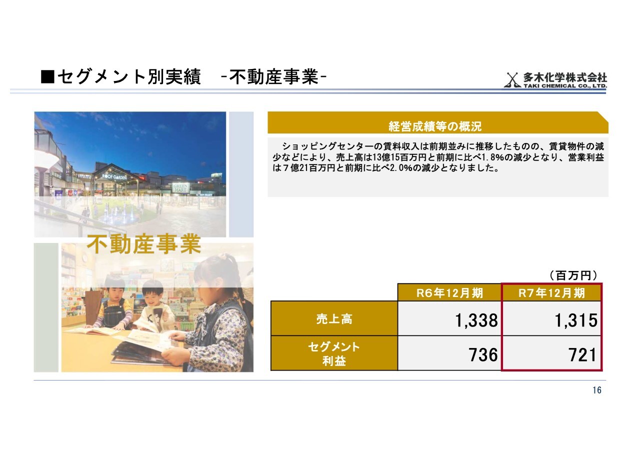 ショッピングセンターの賃料収入は前期並みに推移したものの、賃貸物件の減少などにより、売上高は前期比1.8パーセント減の13億1,500万円、セグメント利益は前期比2.0パーセント減の7億2,100万円となりました。