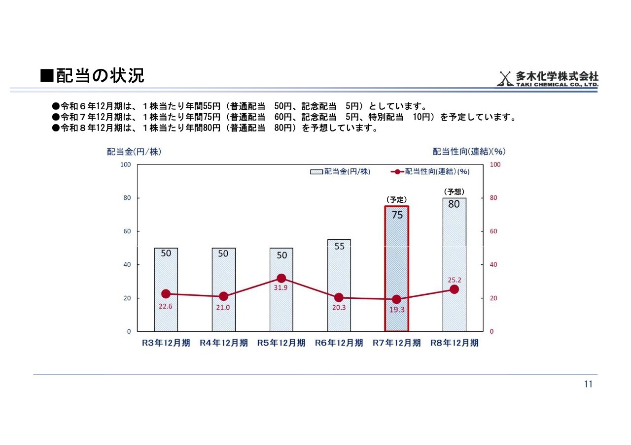 2025年12月期は、普通配当60円、記念配当5円、特別配当10円の1株当たり年間75円を予定しています。