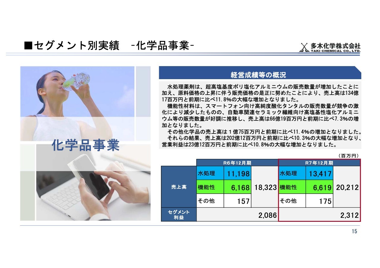 これらの結果、化学品事業全体の売上高は前期比10.3パーセント増の202億1,200万円、セグメント利益は前期比10.8パーセント増の23億1,200万円と、大幅な増加となりました。