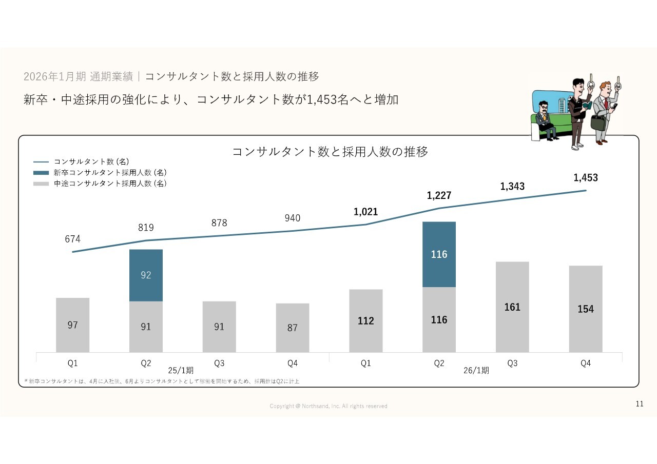 コンサルタント数と採用人数の四半期推移についてです。2026年1月期には、通期で中途コンサルタントを543名採用しました。4月に新卒116名を採用し、第2四半期の6月からコンサルタントとして稼働を開始しています。