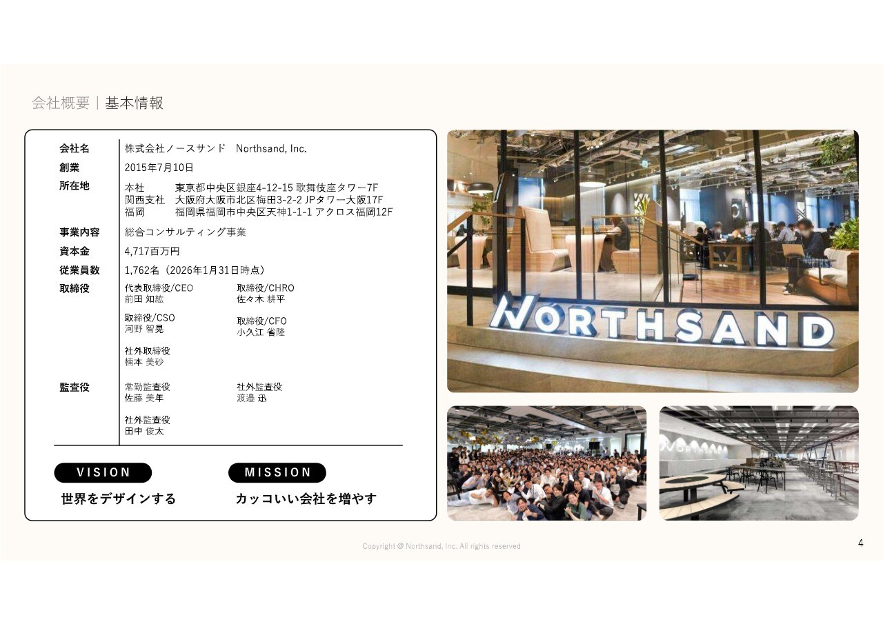前田知紘氏(以下、前田):2026年1月期通期の決算説明を行います。株式会社ノースサンド代表取締役社長CEOの前田です。本日のアジェンダは、スライドのとおりです。最初に会社概要、続いて2026年1月期通期業績、2027年1月期通期業績予想、最後に中長期経営目標をご説明します。