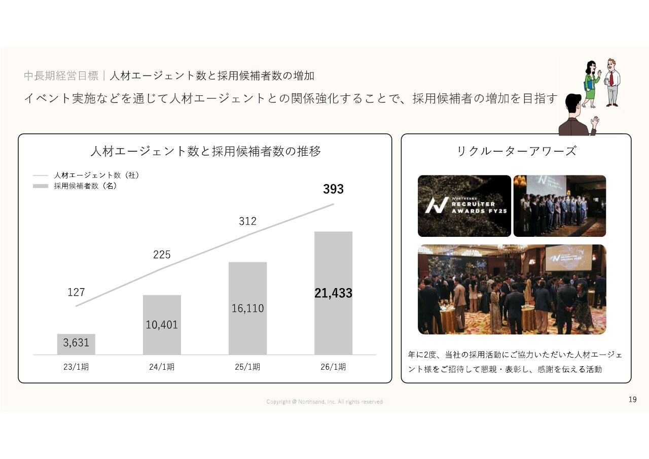 採用については、引き続き人材エージェントとの関係を強化することで、採用候補者数の増加を目指します。2026年1月期には、393社の人材エージェントから2万人以上の候補者をご紹介いただいています。