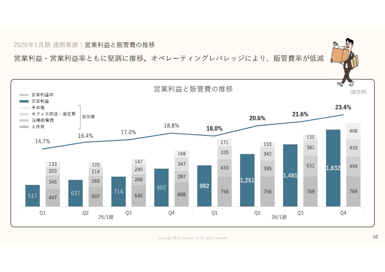 営業利益と販管費の推移です。採用強化に伴い、人件費と採用教育費を中心に販管費が増加しています。しかし、売上の成長がそれを上回り、オペレーティングレバレッジの効果により販管費率は低下し、営業利益率が上昇しています。