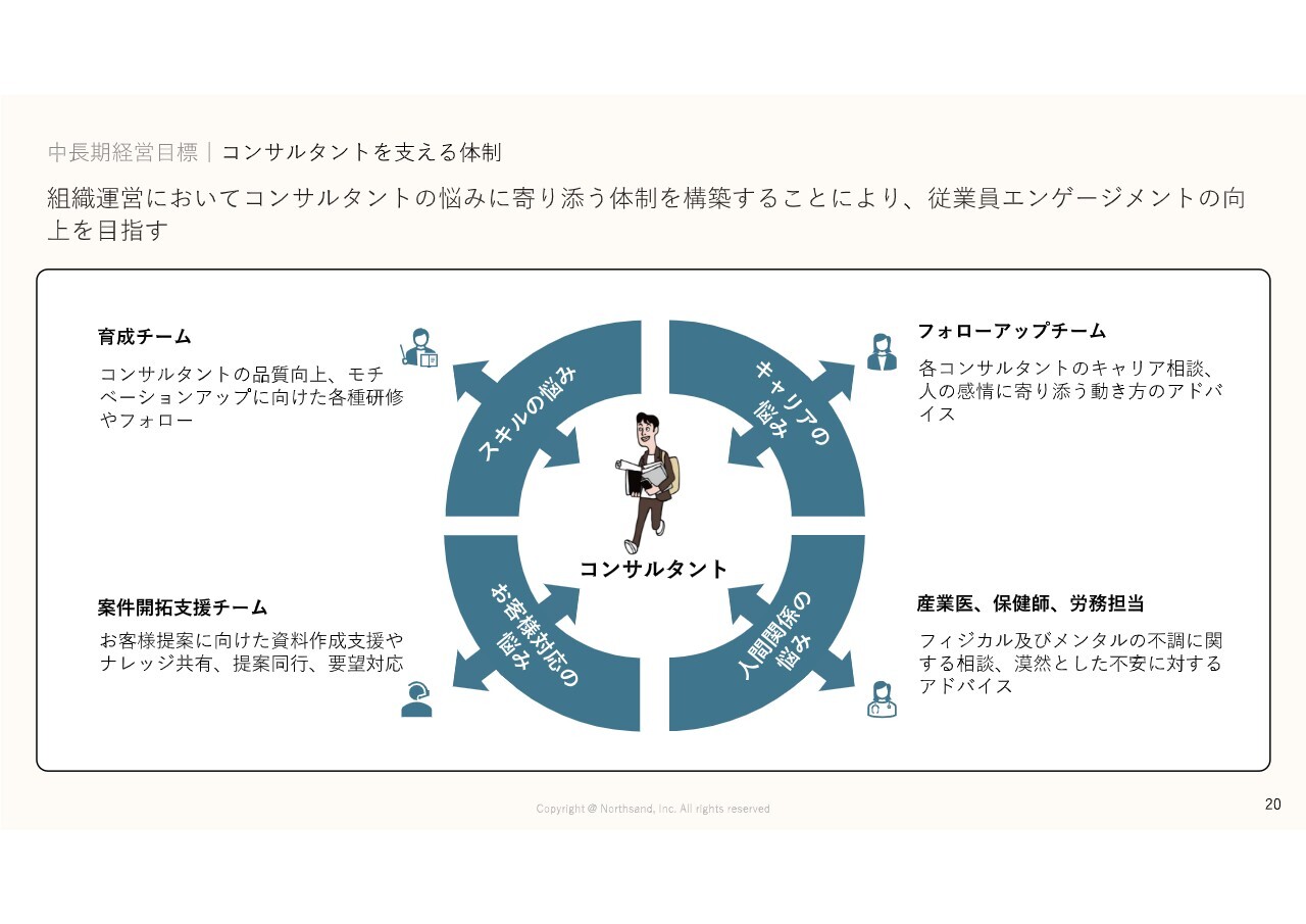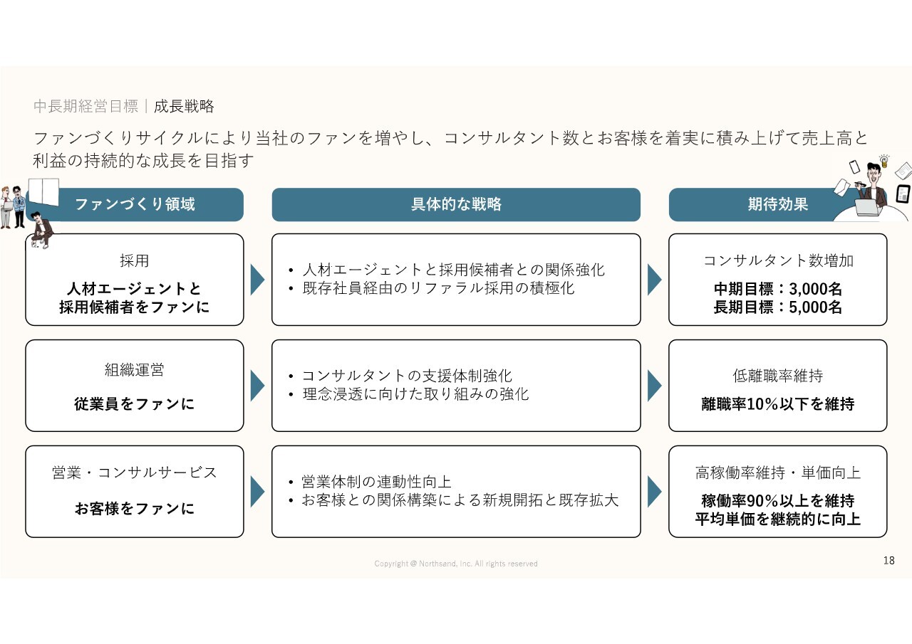 採用では、人材エージェントや採用候補者をファンにすることで、コンサルタント数を中期的には3,000名、長期的には5,000名へと増加させることを目標とします。