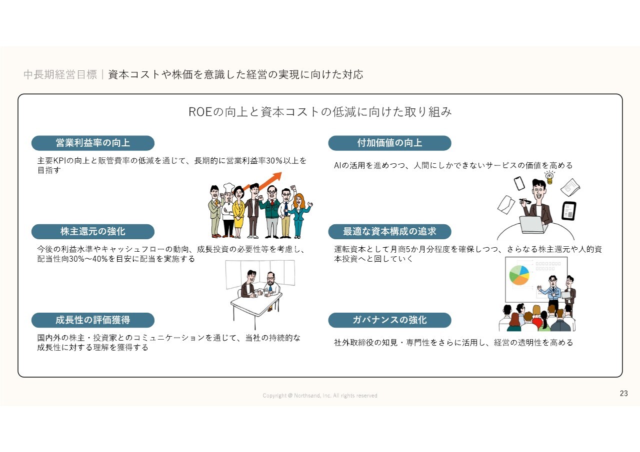 2027年1月期末から配当を実施することを決定しました。配当性向は30パーセントから40パーセントを目安としています。詳細は別途開示していますので、開示資料をご確認ください。運転資本を考慮しながら利益向上と株主還元を両立させ、ROEの向上に努めていきます。