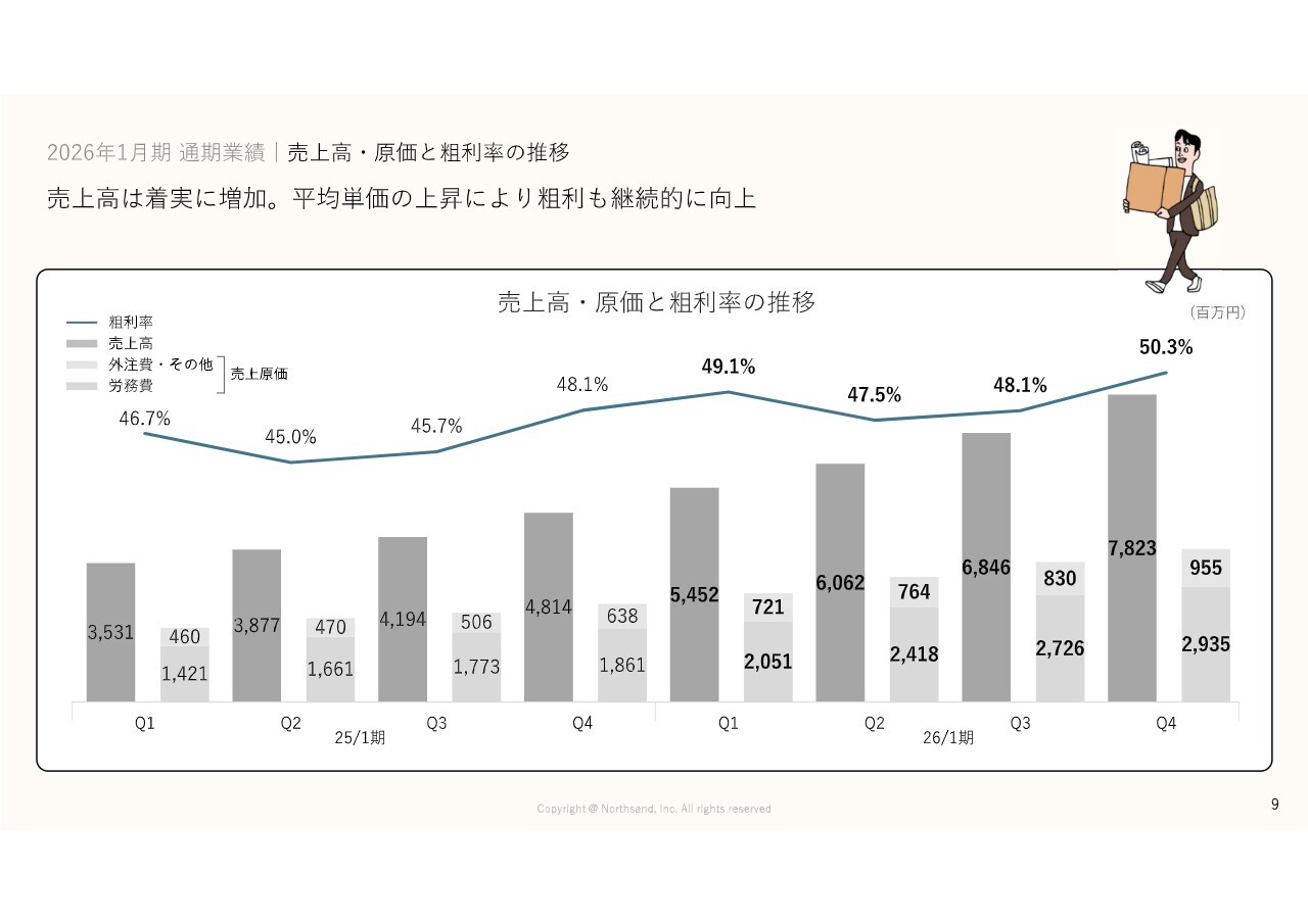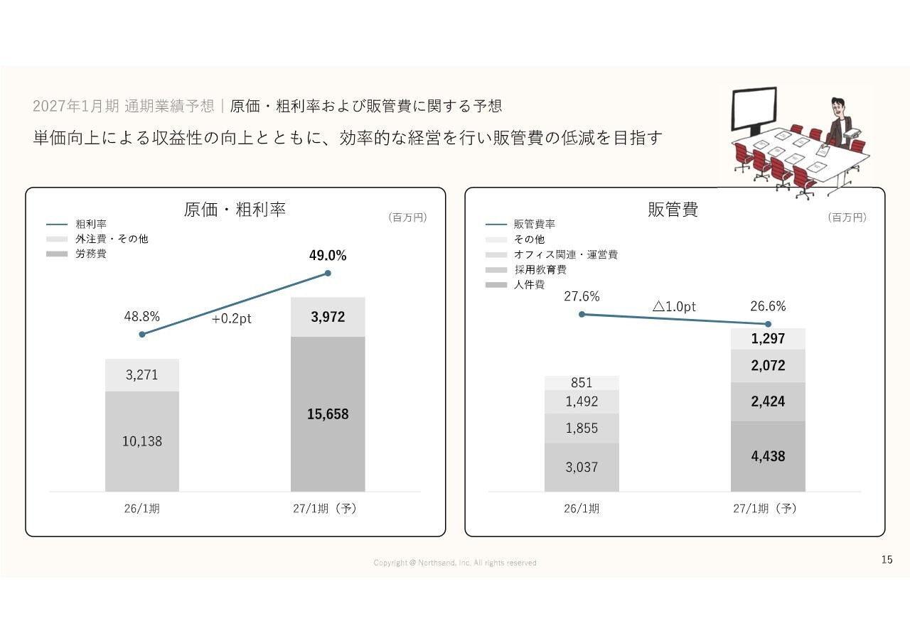 質問者:2027年1月期の粗利率を49パーセントと想定されています。単価が上がるのであれば、もう少し粗利率も上がってもよさそうだと思います。今期は、前年同期比で2.5ポイント近く上がったものの、来期はほぼフラットに見えるのはなぜでしょうか?
