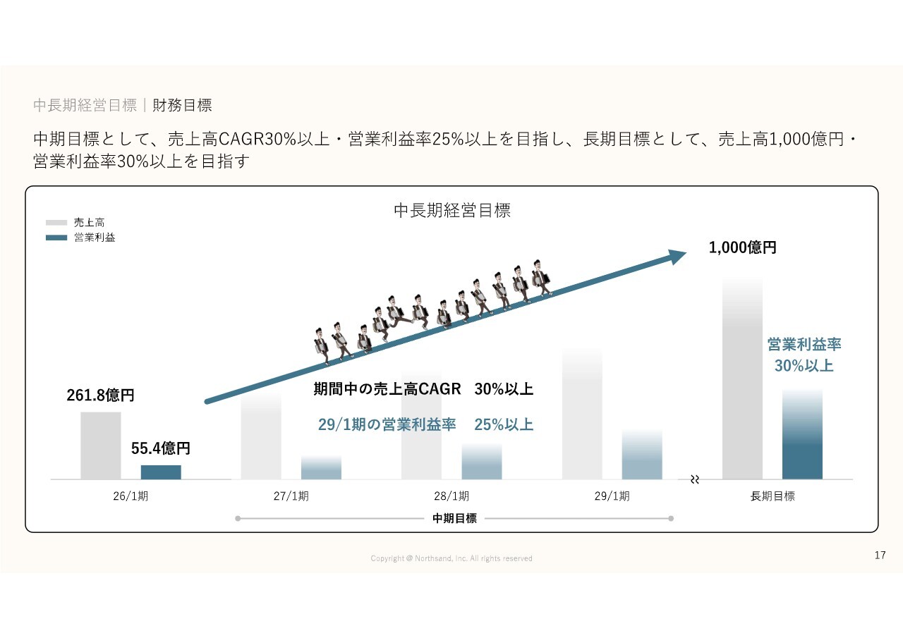 中長期経営目標についてご説明します。財務目標として、2027年1月期から2029年1月期にかけて、売上高は年平均30パーセント以上の成長、営業利益率は25パーセント以上の水準を目指します。長期目標としては、売上高1,000億円、営業利益率30パーセント以上を掲げています。