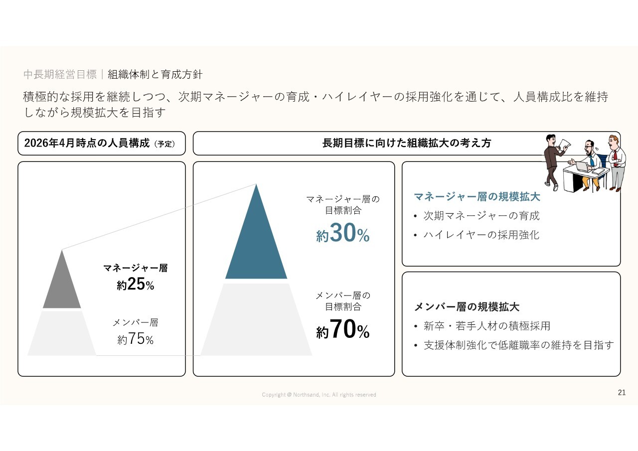 組織づくりにおいては、バランスの取れた人員構成を重視します。マネージャー層については、育成に加え採用も強化し、30パーセントを目指します。新卒や若手人材が中心となるメンバー層を支える組織づくりを進めていきたいと考えています。