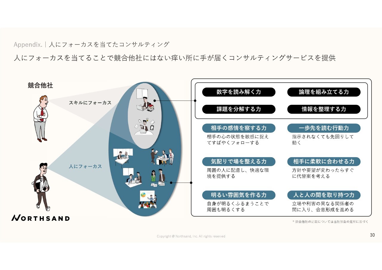3点目として、当社は業界に対する違和感をもとに創業しました。コンサルタントのスキルだけでなく、人間力を活かし、相手の感情に寄り添った対応がAIには代替されないと考えています。この点が当社の強みです。