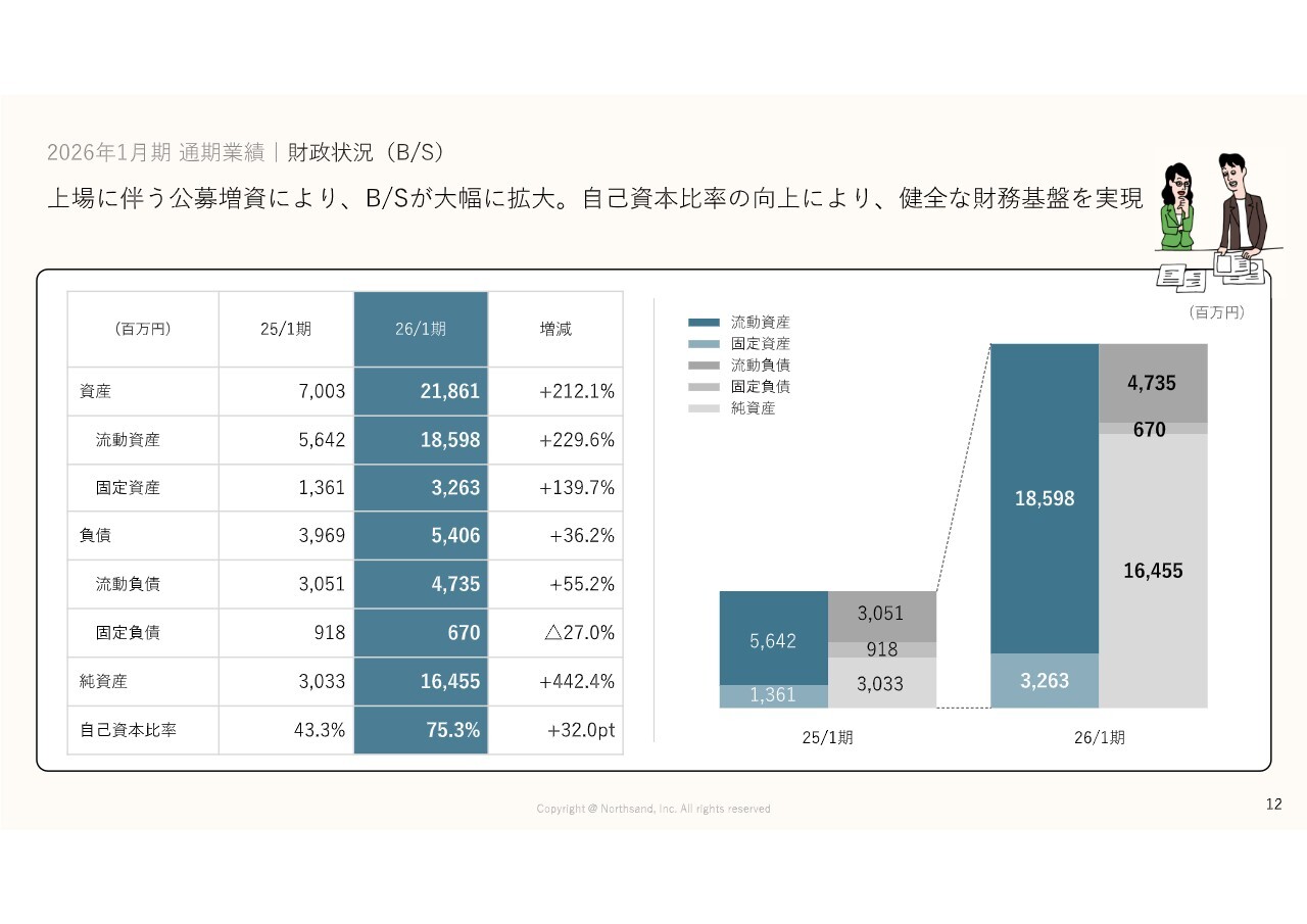 B/Sの状況についてです。上場に伴う資本の増加により、B/Sが大幅に拡大しました。その結果、自己資本比率は前期末比で32ポイント上昇し、75.3パーセントとなり、より健全な財務基盤を構築することができました。