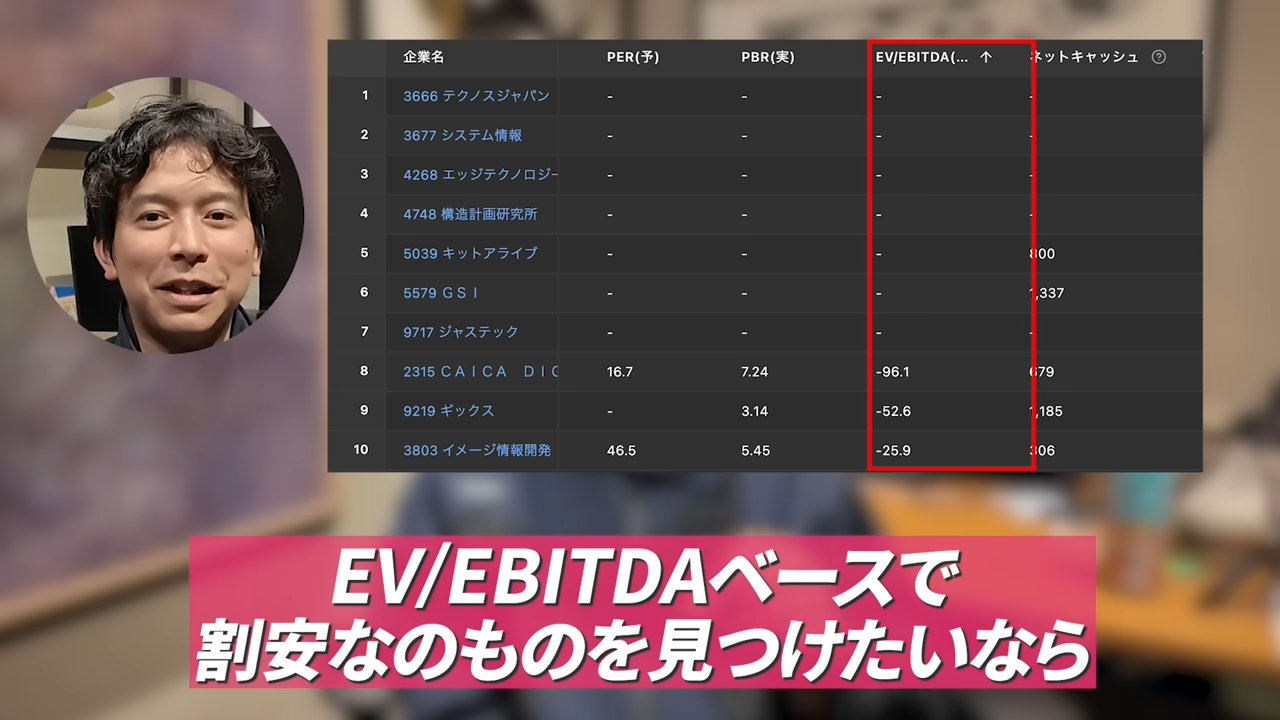 塩谷:そうですね。この指標で見ている人もいると思います。EV/EBITDA倍率2倍以下などとスクリーニングをかける投資家もいるかもしれません。