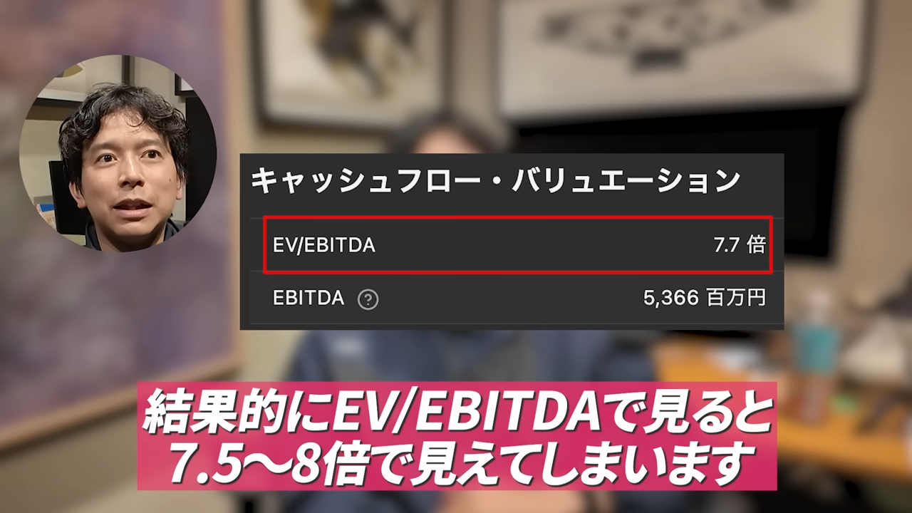 今のEPSベースで見る評価であるため、その背景を踏まえ足元だけの収益体制で見ると割安に見えますが、EV/EBITDA倍率で見ると非常に高いです。