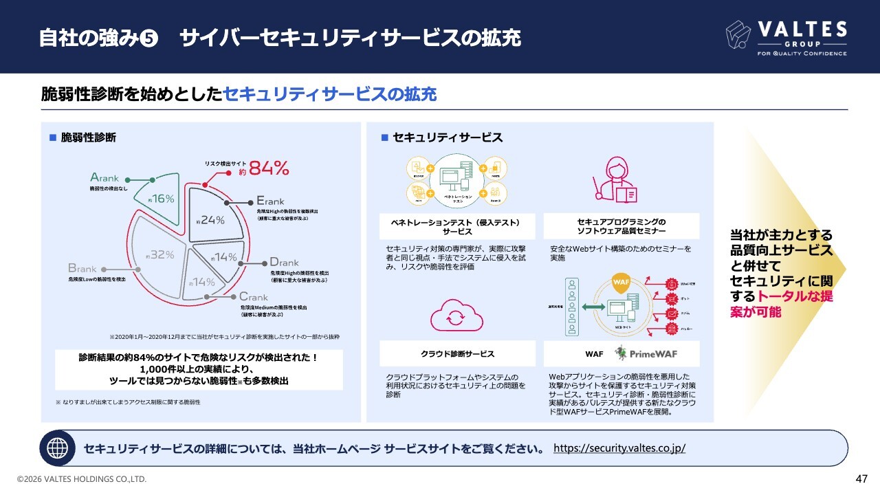 セキュリティ事業では、診断員の教育・人員強化を進めるとともに、セキュリティのサービス領域の拡大を目指していきます。