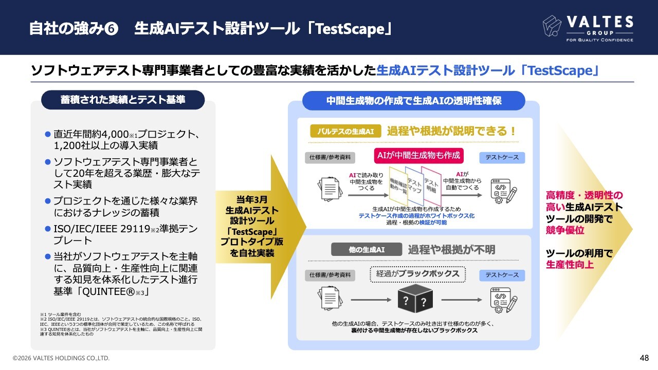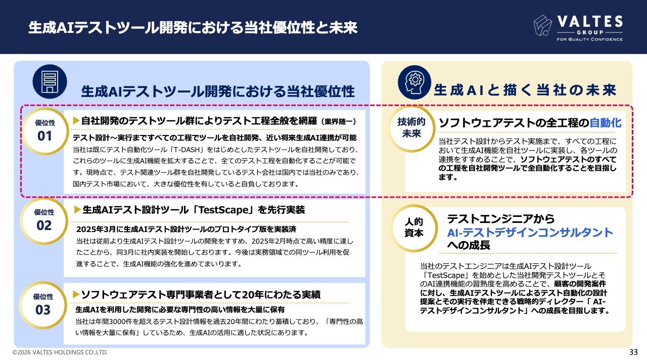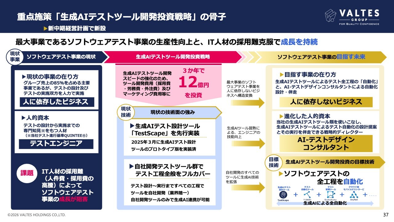 具体的には、基本戦略1については、生成AIテストツール開発投資によって、最大事業のソフトウェアテスト事業を「労働集約型ビジネス」から「人に依存しないビジネス」へ成長させることを目的としています。基本戦略2については、生成AI技術によって、テストの設計から実施まで全行程の自動化を目的としています。