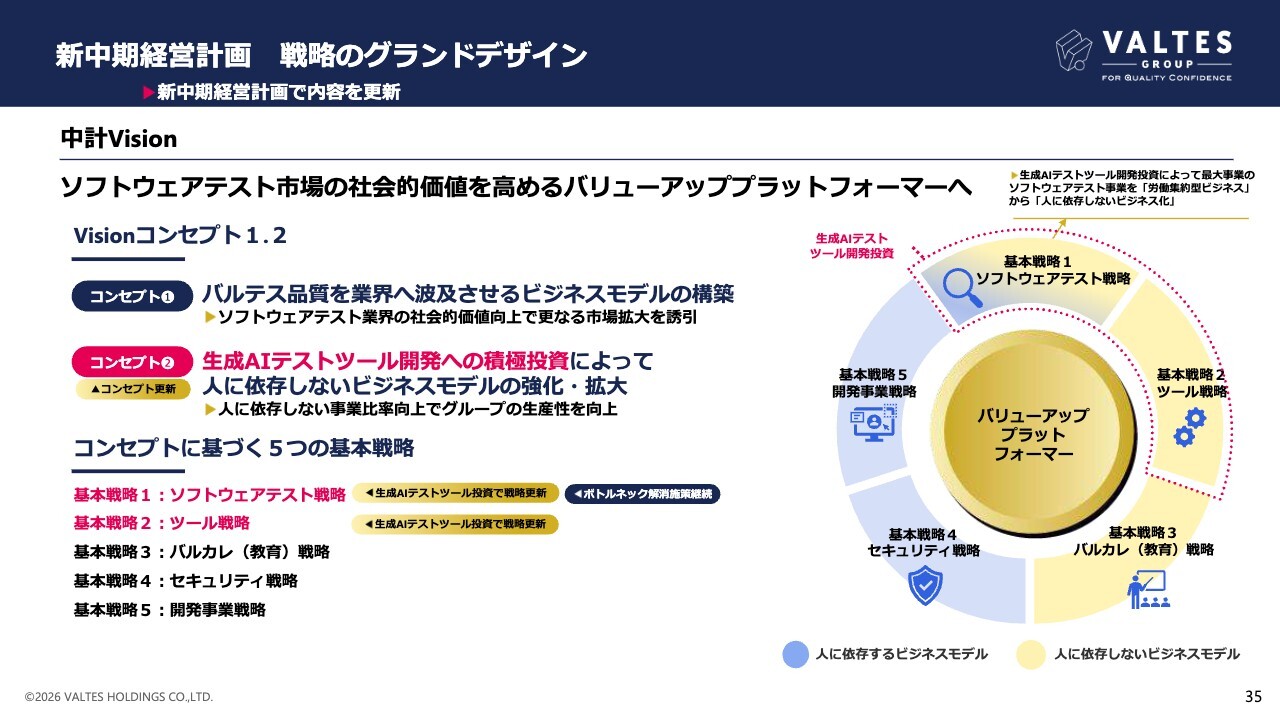 コンセプト2を従前の「人に依存しないビジネスモデルの強化・拡大」から「生成AIテストツール開発への積極投資によって人に依存しないビジネスモデルの強化・拡大」に変更しました。